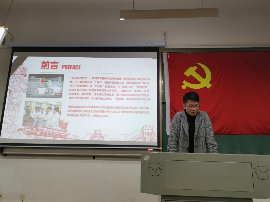 在《智造中国——嫦娥探月》员工讲党课过程中,学三支部柯贤波、徐聂文、陈英等三位员工党员从中国航天发展史、嫦娥探月工程介绍、嫦娥探月工程发展史和嫦娥探月工程的价值意义等四个方面,分别讲述中国航天事业发展历程。当同学们在演讲中说到,本次嫦娥五号月面国旗是由beat365官网中文研制时,现场响起了热烈的掌声。