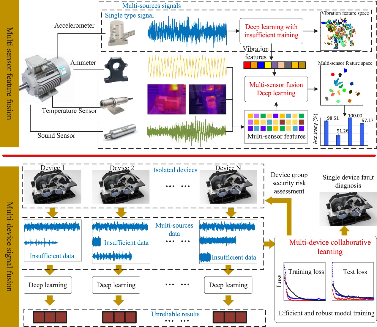 当前该领域研究面临最严峻的挑战是真实工业环境下不完美数据造成智能模型的训练衰退和可靠性不足的问题。最近的研究基于深度学习的故障诊断方法利用来自多个传感器和设备的数据改善故障诊断性能。然而,对多传感器和多器件融合方法的研究缺乏对现有研究优缺点的全面总结,现有的多传感器融合方法分类法并不能完全捕捉到基于深度学习的方法的结构细微差别。