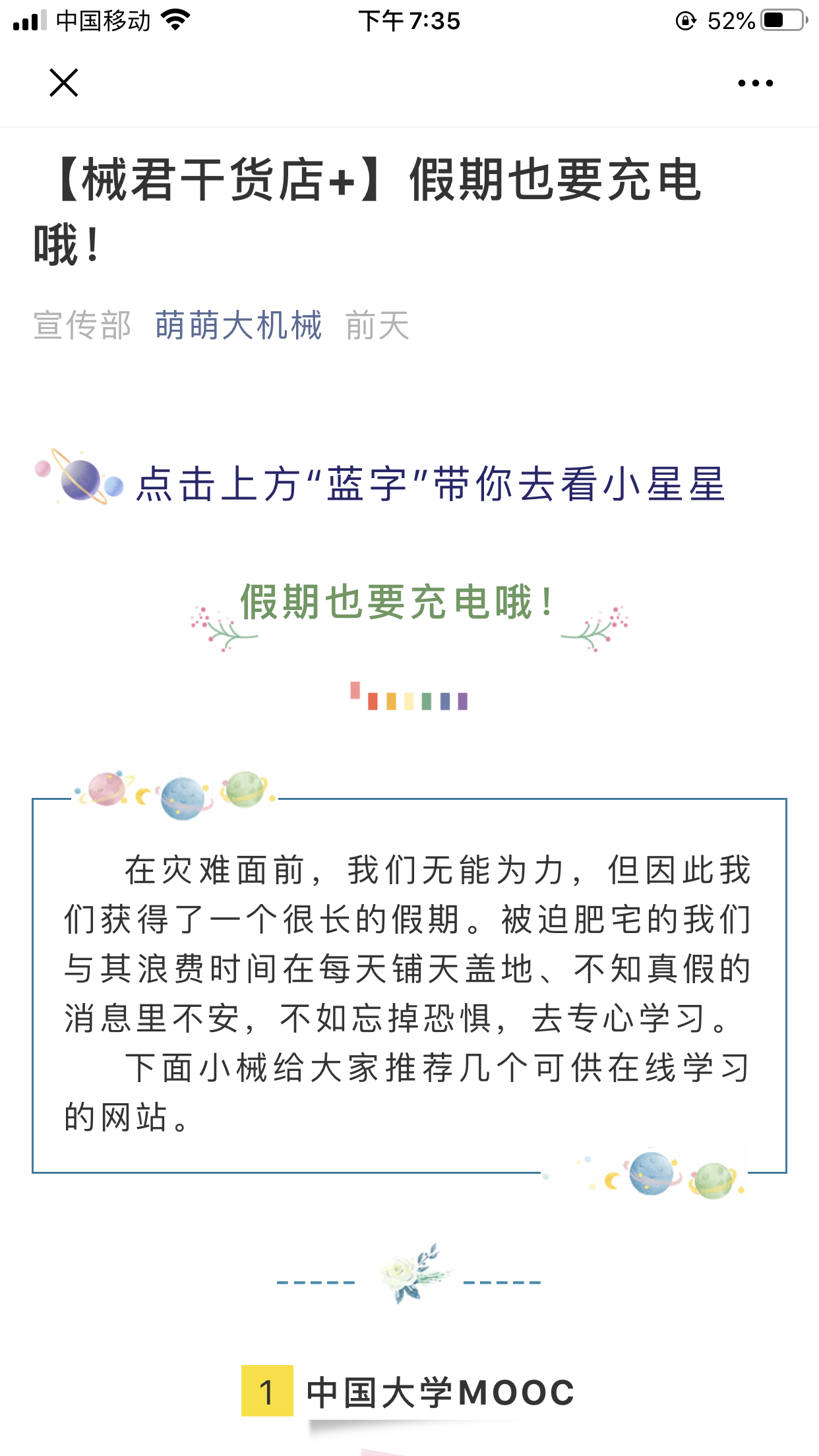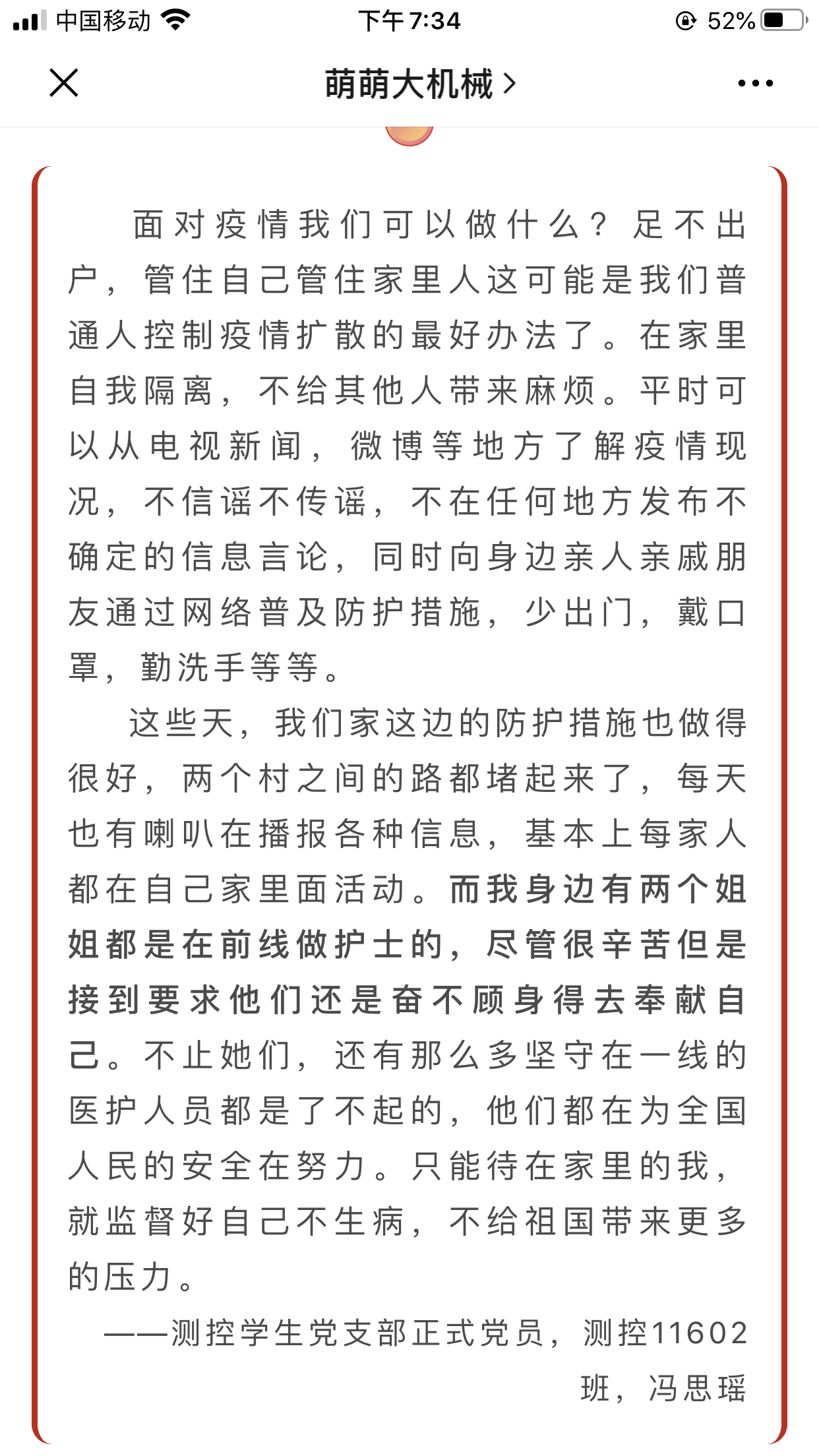 心系“疫”战一线,传递正能量。公司微信公众号“萌萌大机械”从1月22日即推出与防疫相关推文,截止至2月7日已推出19篇。内容从抗疫进度到防疫科普再到致敬抗疫英雄,公司微信公众号将全国一心抗疫的正能量源源不断输送给机械学子。