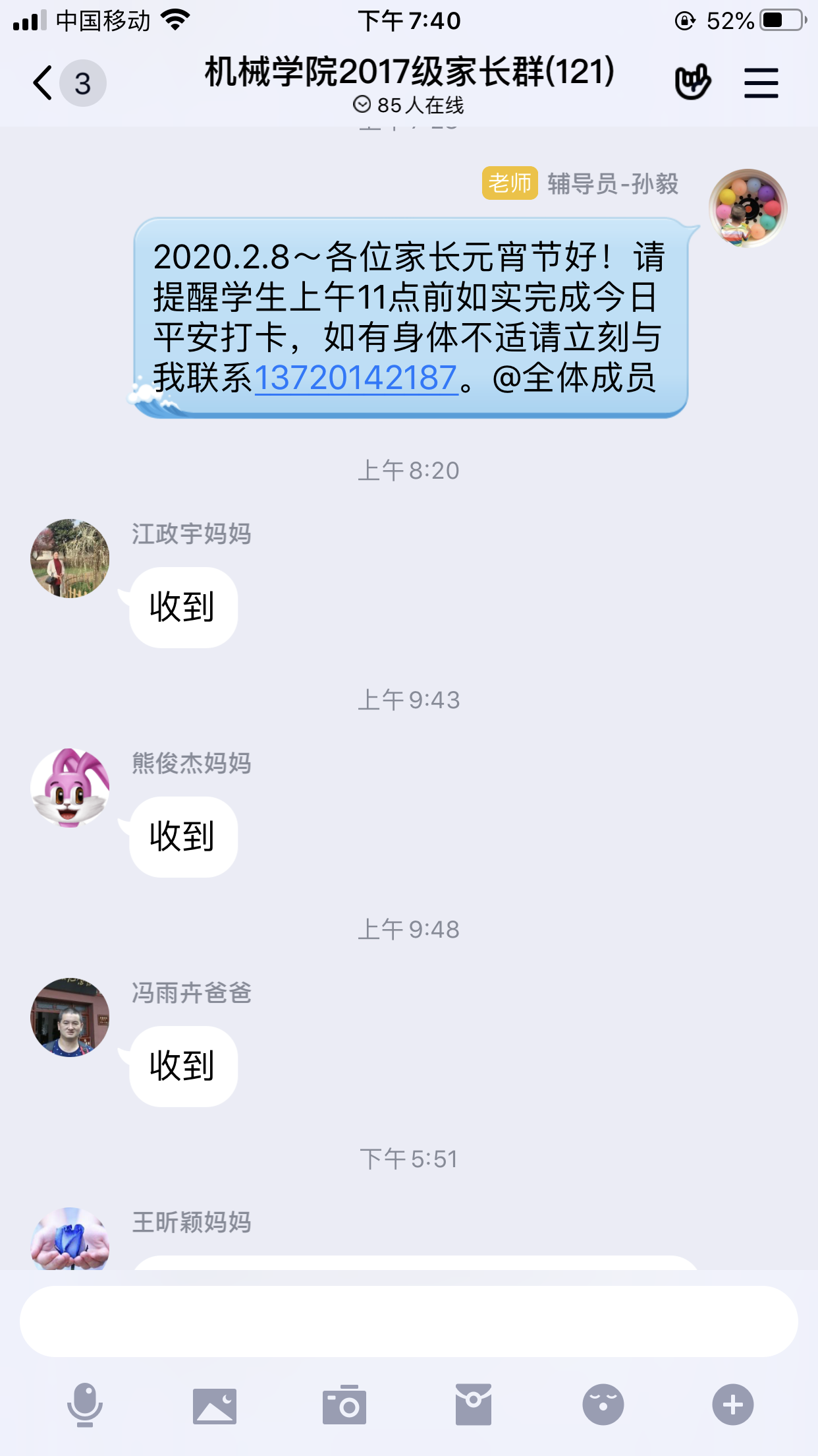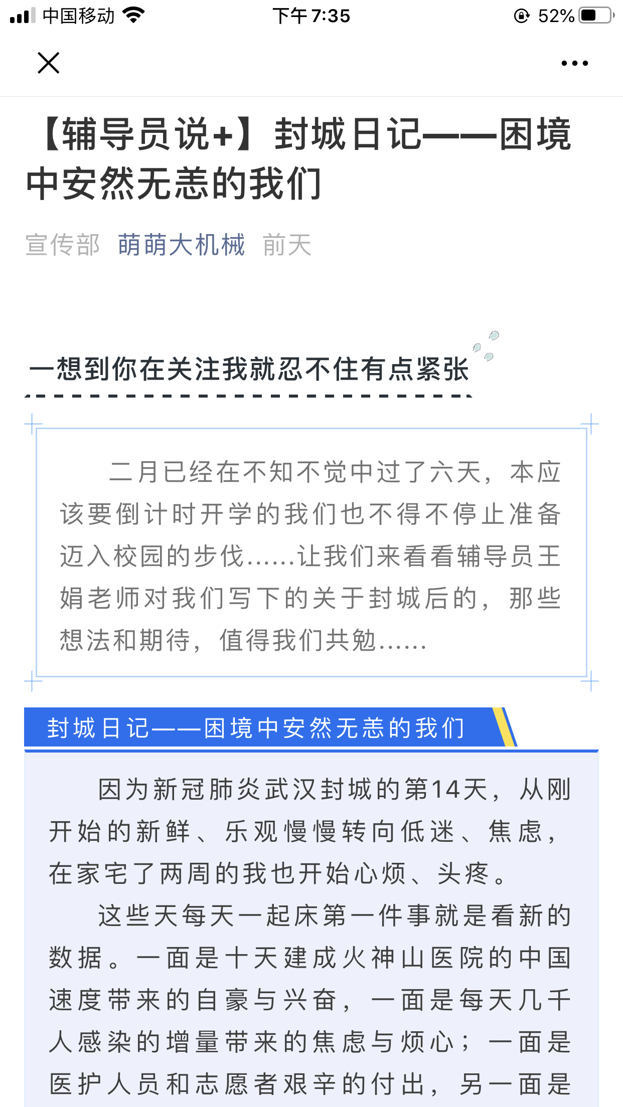 开设“辅导员说+”,关注学子心理健康。根据疫情发展,专家建议隔离在家的时间可能会是1到3个14天。公司关注同学们长期隔离在家的心理健康,做到对困难同学一对一定期电话和QQ关注,并开辟“辅导员说+”一栏,让辅导员跟同学们说说心里话,排解心理压力。第一期推送王娟老师写的“封城日记:困境中安然无恙的我们”一文已受到数百名同学点赞,收效良好。