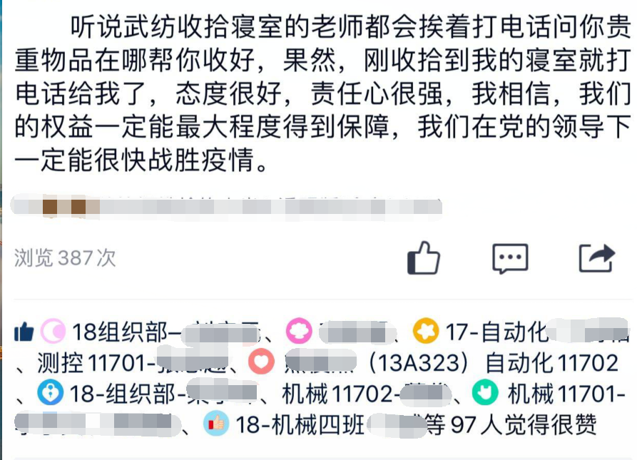 这次储备隔离点涉及到beats365员工所在一个楼栋,带班辅导员孙毅虽然身在老家,不能赶赴武汉参加抗疫,但他迅速在班级群统计员工在校贵重物品清单,一边与清理的老师现场联系,一边做好员工工作,得到同学们支持与点赞。