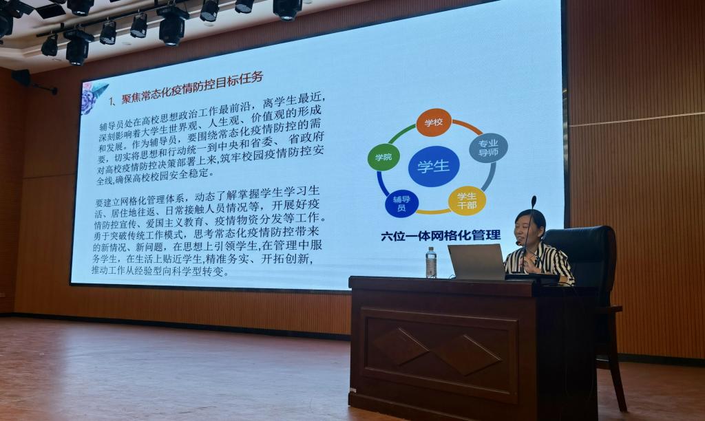 辅导员王娟从自己多年的员工工作经验出发,就后疫情时代的特点、辅导员工作的“变”不“不变”,员工工作三个“聚焦”,用详实的案例深入浅出地讲解后疫情时代里的员工工作要点,强调要把常态化疫情防控目标任务放在首位,加强网络思想政治教育阵地建设,关注员工的心理健康,把疫情战转化为鲜活思政课,善用身边人身边事做好思政教育,真正走进员工心灵,成为员工们青春岁月的摆渡人,渡人渡己,实现自我价值。