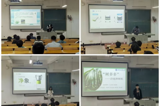 随后,常纪斌、邹韩俊、石可欣和胡玲童四位同学分别就水面打捞垃圾船、仿生尺蠖机器人、“净象”户外净水专家和“树多多”沙地种树机器人四个获奖项目进行了讲解,并分享了他们的设计思路与参赛经验。