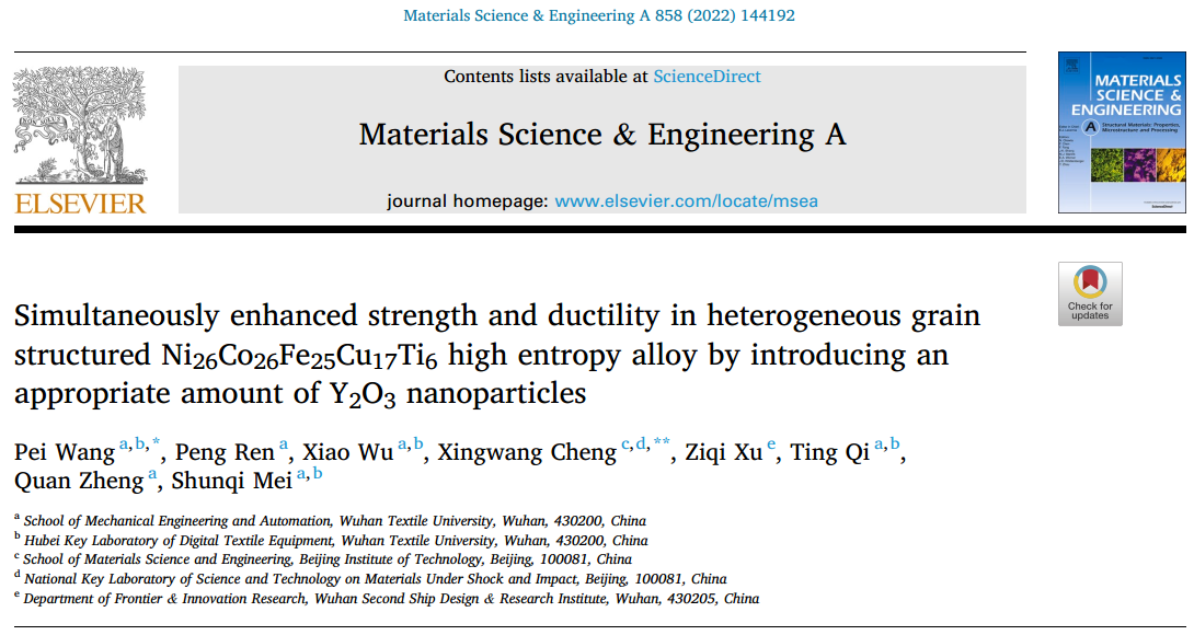 近日,公司beats365青年教师汪佩博士在高熵合金微结构设计强韧化方面取得了重要的研究进展。相关成果以题“Simultaneously enhanced strength and ductility in heterogeneous grain structured Ni26Co26Fe25Cu17Ti6 high entropy alloy by introducing an appropriate amount of Y2O3 nanoparticles”发表在材料科学领域一区Top期刊《Materials Science & Engineering A》上。该论文的第一单位为beat365官网中文,第一作者为公司beats365汪佩博士。