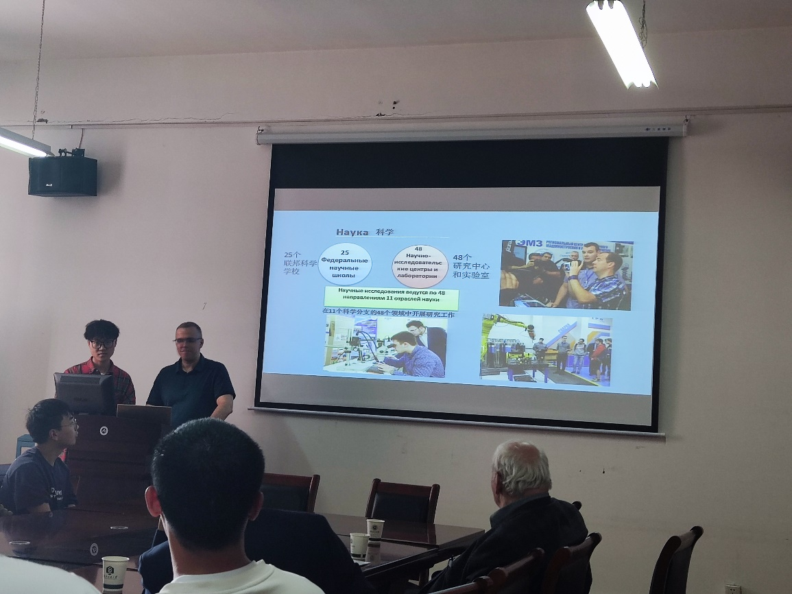 吉耶夫教授是俄罗斯自然科公司院士、国际顶尖的轻质合金材料及加工技术专家、莫斯科科技大学教授以及俄罗斯国家学科专业评议组成员。他的演讲主要围绕机械制造、航空航天机械、纺织轻工机械与高层次人才培养等多个方面展开,其国际化的思维以及丰富的专业心得让在场的师生获益匪浅。而亚历山大教授重点介绍了技术科学领域的研究,主要包括机械和物理技术加工的技术和设备,金属和合金的金属学和热处理两方面。