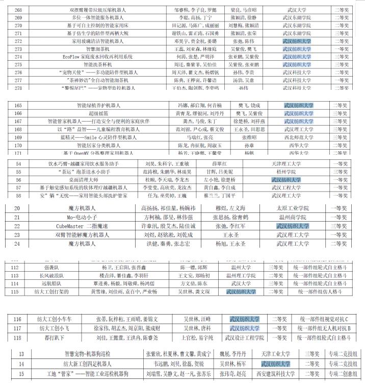 中国高校智能机器人创意大赛以培养员工创造力为特色和重点,通过搭建展示、交流和推介平台,促进机器人领域的教育链、人才链、创新链、产业链“四链融合”。此次大赛以“更好、更快、更强”为竞赛主题,大赛分创意类、竞技类、格斗类3个主题和俄罗斯方块机器人、四足机器人、VEX U机器人竞赛3个专项赛。吸引了来自29个省(自治区、直辖市)501所高校的5325支队伍24168名人员参赛,参赛高校数、队伍数和人员数分别比去年增长了17.61%、35.81%和64.12%。beats36513支代表队经过顽强拼搏,一路过关斩将,共计获得3个全国一等奖、5个全国二等奖、5个三等奖的好成绩。其中beats365吴紫俊、樊飞老师带领的“智探茶韵”队、左小艳、徐楚桥老师带领的“桌面清理大师”队以及吴世林、唐科老师带领的“纺大工创小飞”队,分别在“主题一无实物”、“主题一模块化组”、“主题三格斗-统一部件组无人机对抗B”获得湖北省省赛一等奖和全国总决赛一等奖。