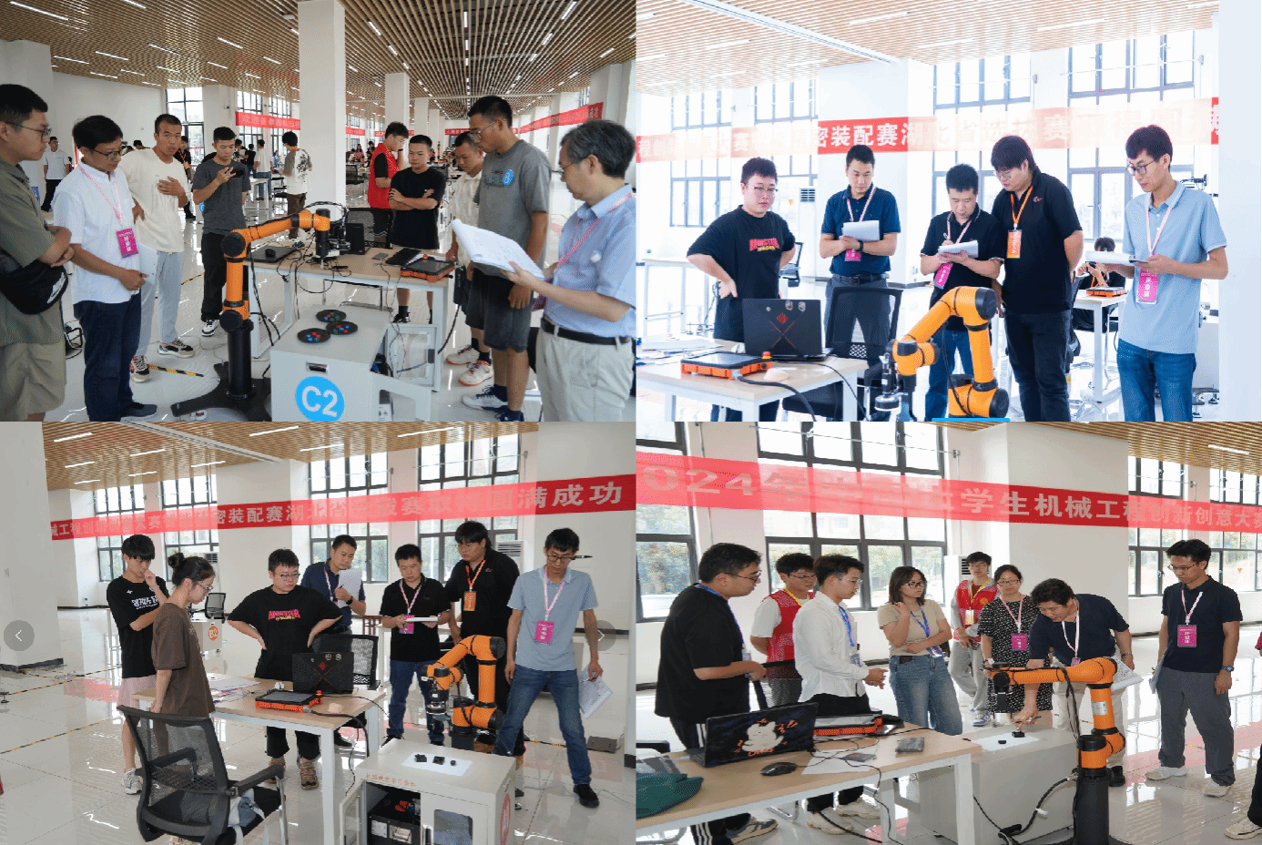 大赛将装配过程精确数字孪生技术、图像识别与精确对准技术、精密抓取技术、精密螺纹连接技术等智能装配关键技术与经济社会各领域紧密结合。各参赛队在竞技环节中角逐,展示了他们在精密装配和智能制造方面的卓越技能。14台协作机器人同时摆开,14支队伍同时开始操作,经过45分钟调试后进行演示,评委现场打分,加上PPT答辩成绩组成最终得分。