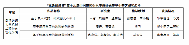 近日,公司研究生团队在“兆易创新杯”第十九届中国研究生电子设计竞赛华中赛区取得佳绩,荣获华中赛区一等奖、二等奖、三等奖各一项,公司一等奖团队指导教师张成俊教授荣获优秀指导教师奖。