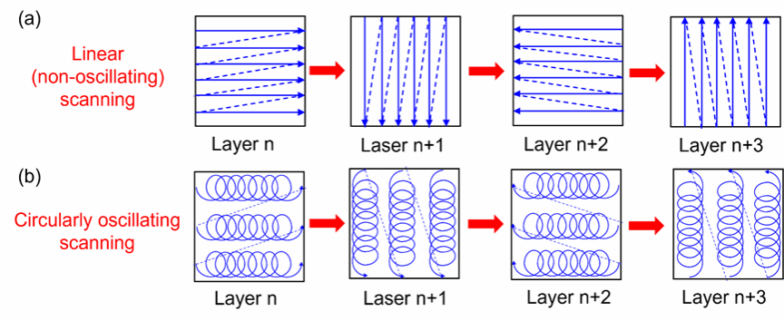 图1两种扫描策略的原理示意图:(a)直线(非振荡)扫描策略;(b)圆形振荡扫描策略