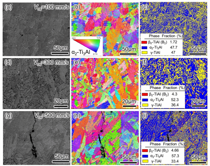 图2 采用圆形振荡扫描策略成形TNM合金试样纵截面的EBSD分析结果:(a~c)Vos=100 mm/s;(d~f)Vos=300 mm/s;(g~i)Vos=500 mm/s;(a,d,g)BC图;(b,e,h)反极图;(c,f,i)相分布图