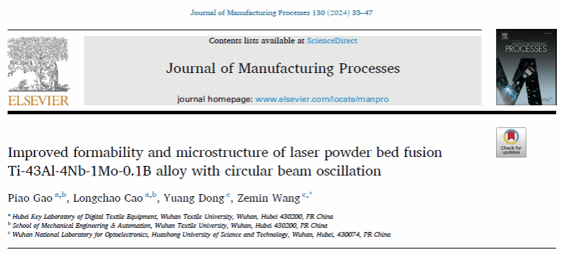 近日,公司beats365曹龙超课题组青年教师高飘博士在激光增材制造TiAl合金工艺与机理研究方面取得了重要的研究进展。相关成果以“Improved formability and microstructure of laser powder bed fusion Ti-43Al-4Nb-1Mo-0.1B alloy with circular beam oscillation”为题发表在工程技术领域中科院一区Top期刊《Journal of Manufacturing Processes》(ISSN:1526-6125)上。该论文的第一单位为beat365官网中文,第一作者为beats365高飘博士。