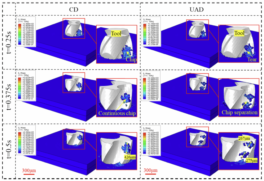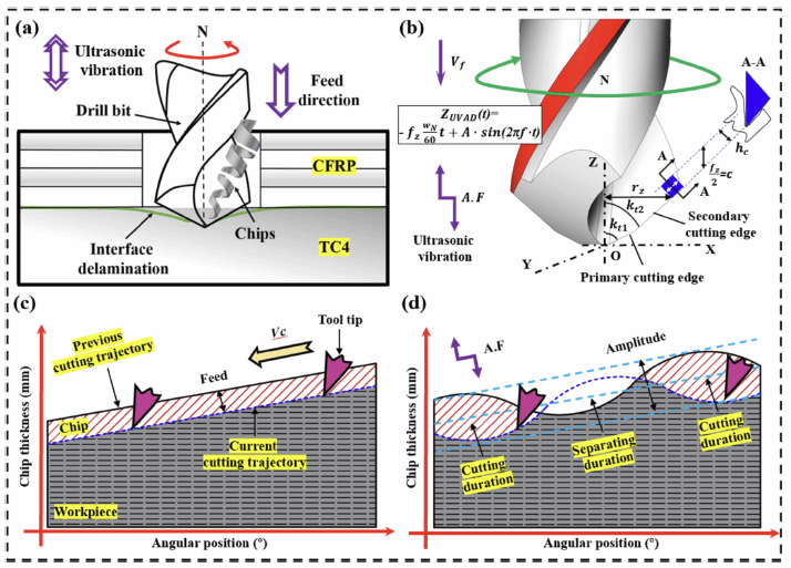 在此背景下,本研究通过综合运用实验、理论模型及有限元仿真的方法,深入探索了CFRP/Ti叠层在超声辅助钻削(UAD)过程中的加工机理与材料去除机制。通过采用自行研发的高频振动超声主轴,系统地研究了不同加工条件下切削力、切屑形态、孔内壁形貌、孔进出口表面特性以及刀具磨损的变化规律,并将实验数据与仿真结果进行了细致的比对分析。本研究揭示了UAD过程中复杂的加工机理,深入剖析了热-力耦合效应、材料界面处的热量与应力传递机制以及潜在的材料损伤模式。该研究为CFRP/Ti叠层材料的高精度、高质量钻削提供了全新的见解与解决方案,具有重要的理论与实践价值。