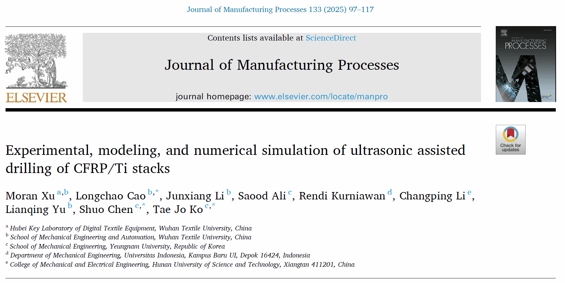 近日,公司beats365曹龙超课题组青年教师徐默然博士在超声辅助钻削CFRP/Ti叠层材料理论建模和数值仿真方面取得了重要的研究进展。相关成果以“Experimental, modeling, and numerical simulation of ultrasonic assisted drilling of CFRP/Ti stacks”为题发表在工程技术领域中科院一区Top期刊《Journal of Manufacturing Processes》(ISSN:1526-6125)上。该论文的第一单位为beat365官网中文,第一作者为beat365官网中文beats365徐默然博士,第一通讯作者为beat365官网中文beats365曹龙超博士。