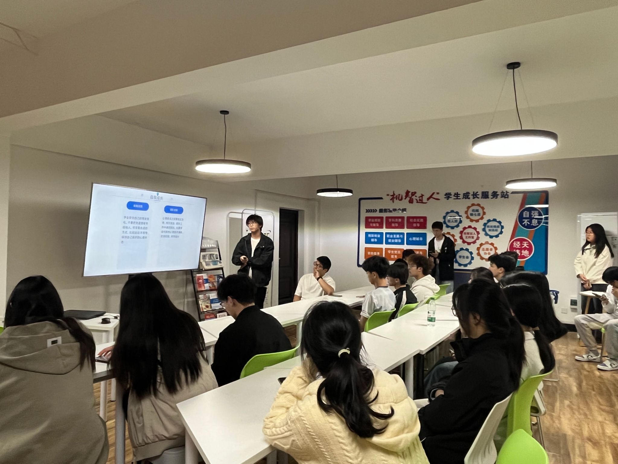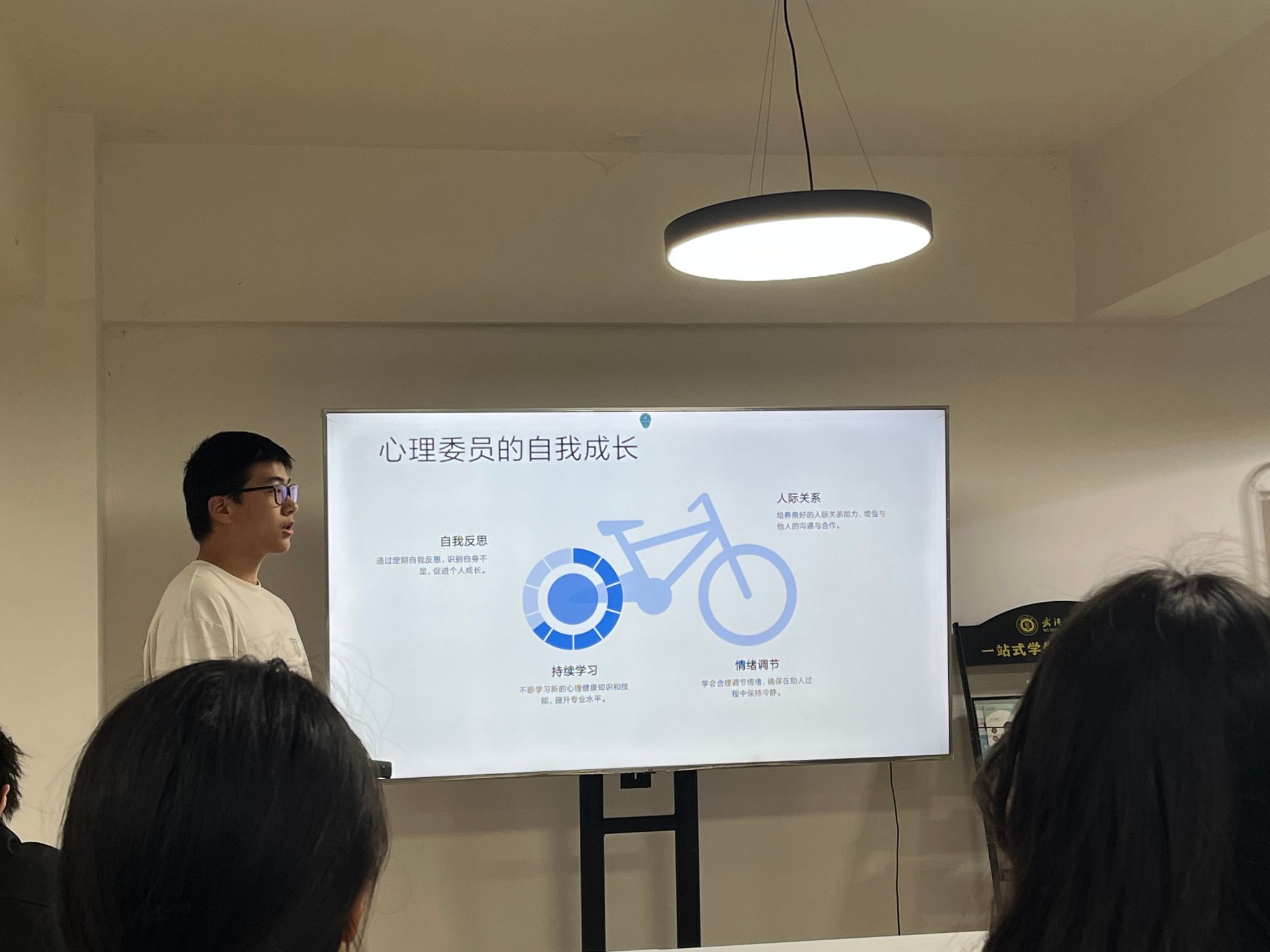 活动伊始,作为代表的心理委员殷战同学以PPT演讲的形式,围绕“心理委员的职责”展开分享。他从心理委员的角色定位,工作职责和自我成长等方面入手,结合真实案例,帮助心理委员明确职责、掌握基础心理辅导方法。另一位代表王少杰同学详细介绍了心理委员的影响力及技能,使同学们对于心理委员这一职务有了更清晰的认知。两位同学的演讲内容互补,赢得了大家的热烈掌声。