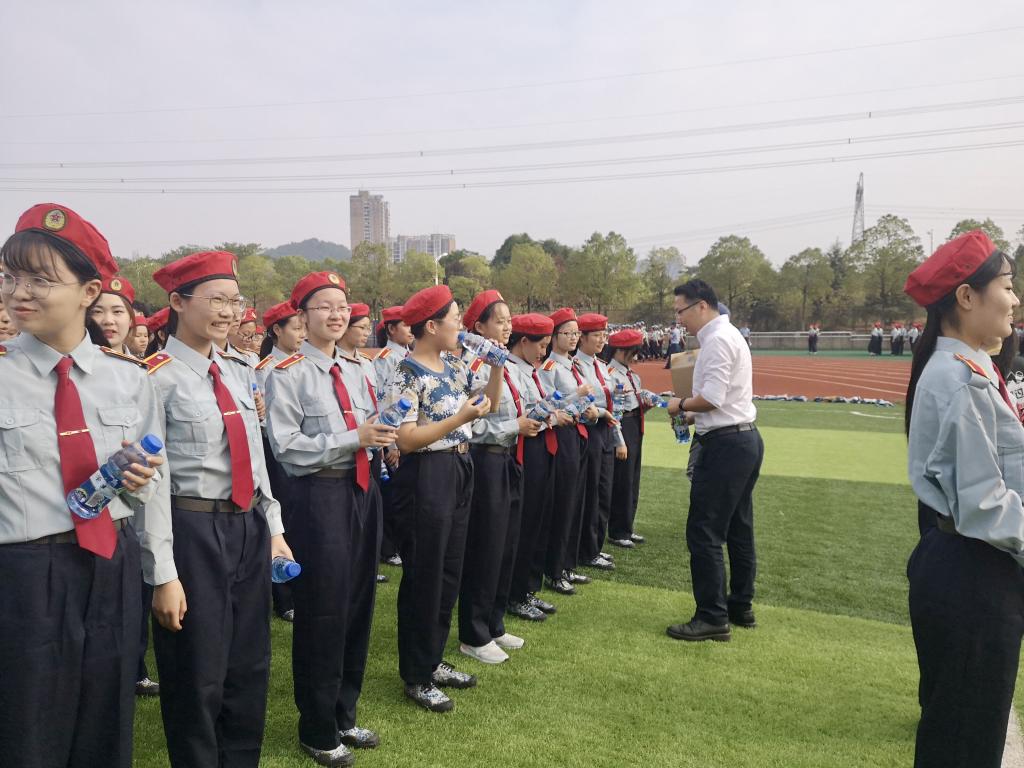 利用方队的军训休息期间,员工会成员们在刘书记的带领下,有条不紊的进行着送水工作,热情的为每一位认真训练的新生提供服务。刘书记暖心的慰问新生们近几天的军训感受,并鼓励同学们继续努力,培养吃苦耐劳、坚韧不拔的卓越精神。