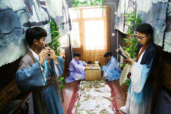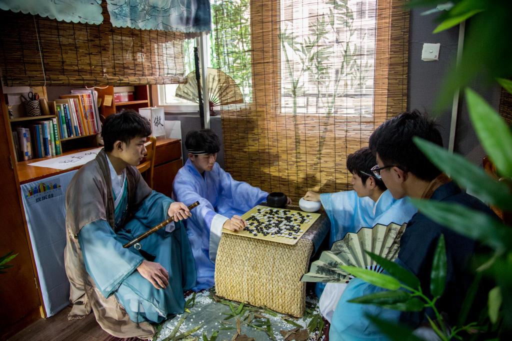 3月26日,前来采访的记者在公司老师的陪同下来到位于阳光校区4栋B座的这间男生宿舍。宿舍里,走道铺的石板路上散落着落叶和白石子,竹帘装饰的墙壁上绿竹掩映,折扇和书法作品等元素随处可见,几位古装少年在下棋吹笛自得其乐,让人仿佛穿越古代开启一场奇妙之旅。