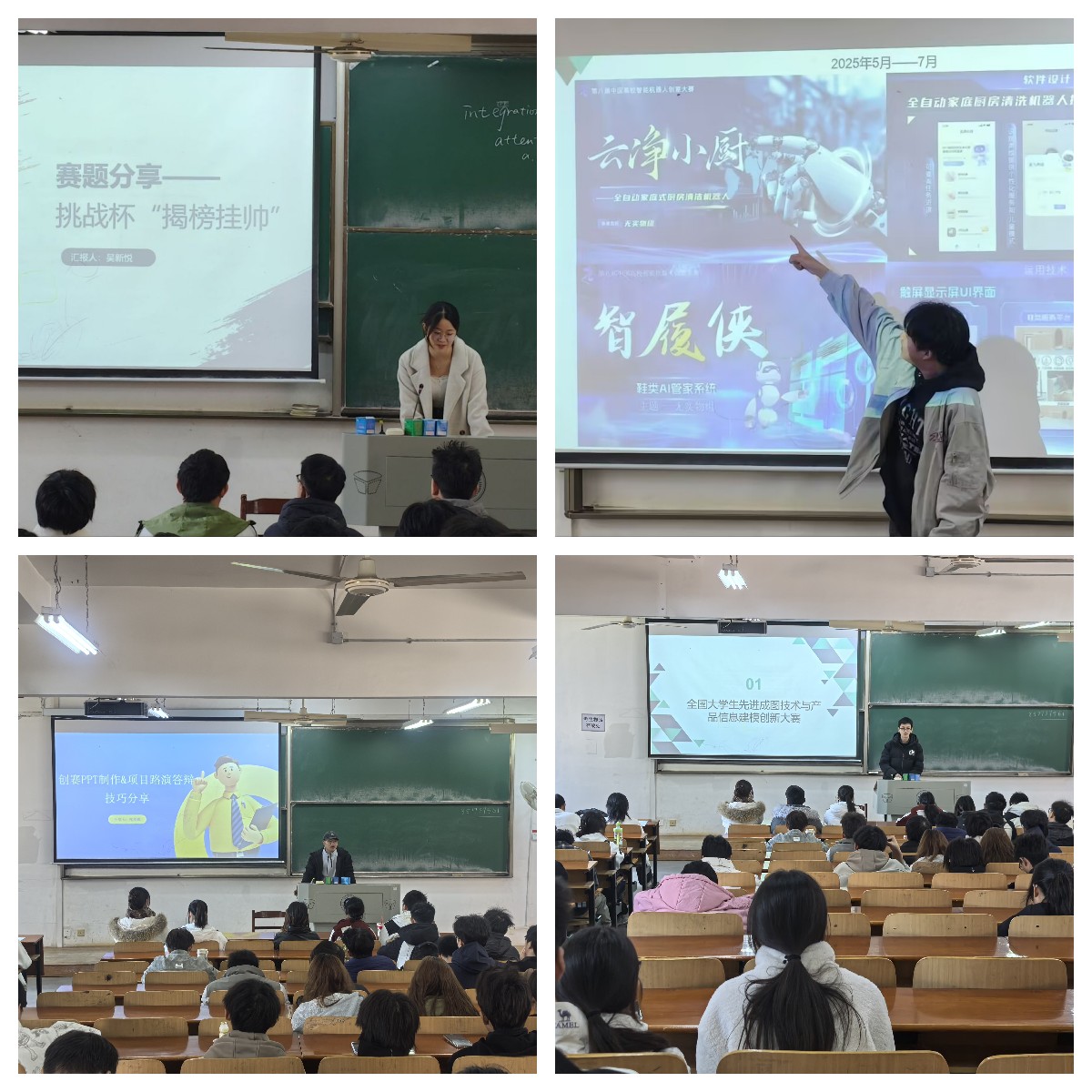 为增强备赛指导的针对性与实效性,本次宣讲会以“精工筑梦,智创未来”经验分享为主题,邀请在多项高水平竞赛中取得突出成绩的员工代表进行交流。首先,吴新悦同学作为“挑战杯”全国一等奖获得者,以《“挑战杯”国一获得者经验分享》为题做了经验交流。她从项目选题、团队构建、材料打磨到现场答辩,全方位解析了问鼎顶级赛事的路径与方法,为同学们备战“科创杯”并冲击“挑战杯”提供了直接、权威的参照。此外,论坛还邀请了在不同专业赛事中表现优异的同学进行多维分享:任鹏钰以智能精密装配赛为例,剖析了技术类竞赛的体系与核心要求;胡闯分享了机器人竞赛从基础到实战的系统训练历程;刘淼鑫复盘了在创意大赛中从零起步到荣获国家级奖项的完整策略。张厚强则聚焦竞赛展示环节,讲解了PPT制作与答辩陈述的实用技巧;张庆乐从生涯规划角度,探讨了竞赛经历与升学、就业的联动关系;陈永康结合自身参赛经历,阐释了如何将专业知识转化为竞赛优势。