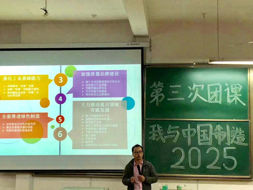 第三次团课院团委书记梁祥云老师给大家带来了“我与中国制造2025”,梁老师从当前的国际国内有关热点包括中国军事、科技等取得的成绩与现状,给大家解读有关中国制造业和“中国制造2025”有关内容。鼓励大家沉心学习,以科技报国。