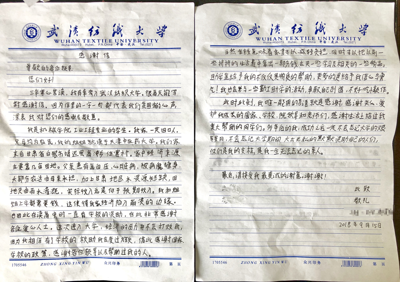 “我感谢中国共产党!党的温暖关怀和爱心人士的慷慨捐助让我没齿难忘,感谢党的帮扶政策,感谢公司领导老师春风般的关爱与帮助,我也绝不辜负公司和老师们对我的殷切期望,一定会努力学习,将来回报祖国和社会。”2018级受助贫困员工小小(化名)同学在给公司领导的感谢信中这样写道。