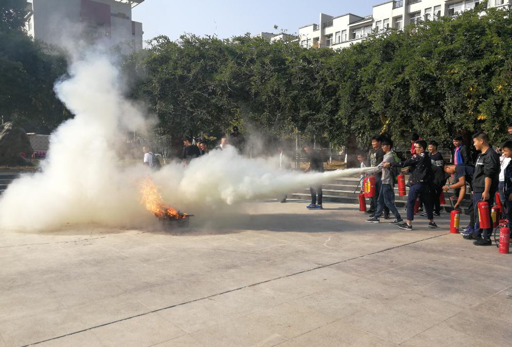 现场的灭火器灭火作业演习,校保卫处的老师通过现场展示向大家生动而详细地介绍了干粉灭火器的使用方法,面对火情,将灭火器取出适当摇匀,拔出栓销,距离1~2m将喷嘴对准火源根部喷射即可。为了让现场的同学掌握灭火器的使用方法,保卫处准备了数十个干粉灭火器供大家练习操作。工作人员在空旷地燃起一堆火焰,同学们分组学习手持灭火器向火源喷射,火势迅速被扑灭。