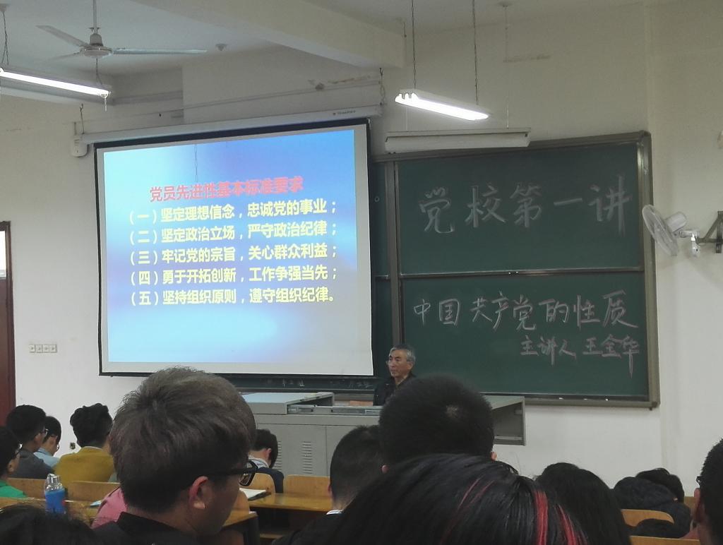 王金华教授首先介绍了党的性质,从思想上解决同学们的入党问题;紧接着详细讲解了共产党党史,并告诫大家:要以史为镜,铭记党史,对今后党性的学习乃至未来面对人生道路上的重要抉择都起着十分重要的作用;随后他简述了党的阶级性和先进性,并举出雷锋同志等一系列当代中国共产党先进代表的光荣事迹,鼓励同学们积极向党组织靠拢,时刻用党员的标准严格要求自己。