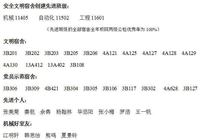 梁祥云老师宣读了表彰决定。在2016年安全文明宿舍创建及宿舍文化节等各项活动中,涌现了一批先进集体及个人,公司分团委决定授予机械11405班等3个班级为“安全文明宿舍创建先进班级”荣誉称号,授予3B201等14间宿舍为“文明宿舍”荣誉称号,授予3B306等10间宿舍为“党员示范宿舍”荣誉称号,授予张美菊等8人为“安全文明宿舍创建先进个人”荣誉称号,授予江明轩等4人为“机械好室友”荣誉称号。