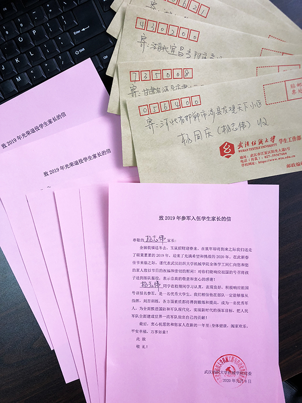 “beats365全体学工同仁向您和您的家人致以节日的祝福和亲切的慰问!对你们能响应祖国的号召将孩子送到部队服役,表示崇高的敬意和衷心的感谢! ” 2020年新春佳节来临之际,beats365给2019年度参军入伍和光荣退役同学的家长寄发慰问信,向家长们致以节日的祝福和亲切的慰问,对他们积极响应号召将孩子送到部队服役表示崇高的敬意和衷心的感谢。