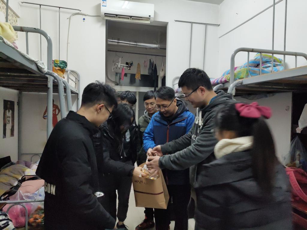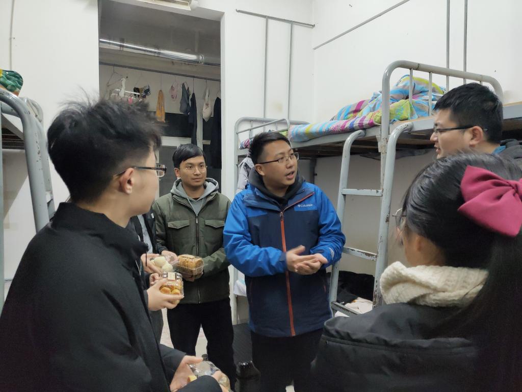 在宿舍里,刘韦副书记和辅导员老师对同学们不畏严寒,在校坚持集训备赛的精神表示充分肯定,亲切询问大家在校生活起居、回家车票是否买好等情况,叮嘱大家在校期间要注意寝室用电安全,保管好个人财物,与家人、老师保持联系。在了解到大家每天高强度的集训安排后,刘书记勉励大家一定要珍惜集训的宝贵时光,多向数计公司指导老师学习请教,树立信心、不断拼搏、挑战自我、开拓创新,争取取得优异成绩,为公司争光。