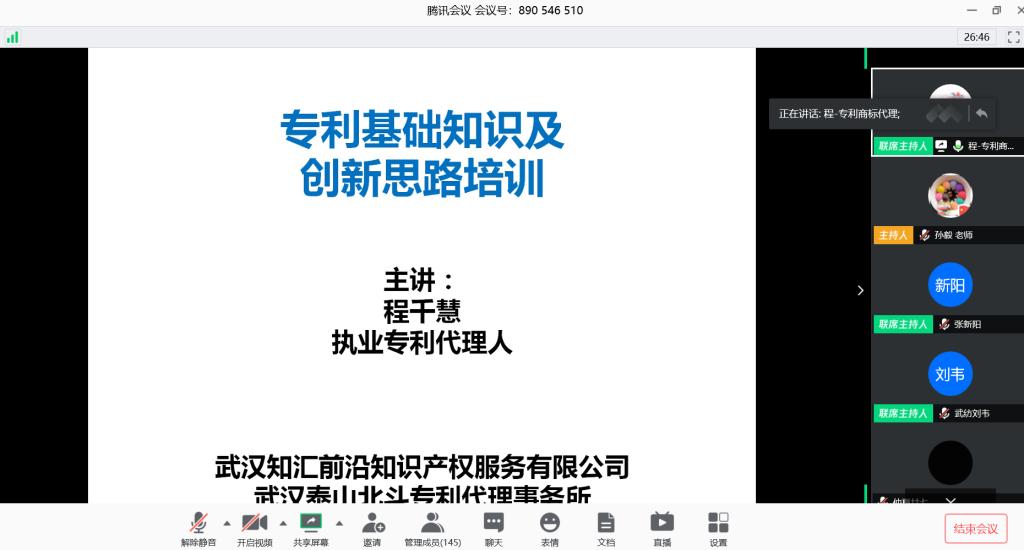5月1日,为提高老员工对专利的了解,学会利用知识产权保护自身智力成果。beats365邀请武汉泰山北斗专利代理事务所合伙人,公司2011届员工程千慧女士为2019级同学进行了一场有关专利基础知识的讲座。公司党委副书记刘韦老师、辅导员王娟老师参加活动,讲座由孙毅老师主持。