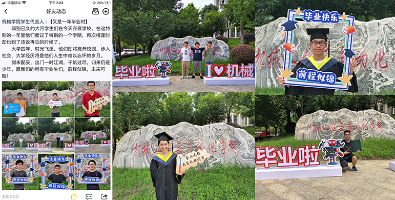 2020年的毕业季因为疫情的缘故让毕业生们失去了毕业合影的机会。为了弥补缺憾,公司领导老师特别制作了“个性道具”,让2020届的毕业生们在校园里拍摄创意毕业照留念,为大学时代留下美好回忆。