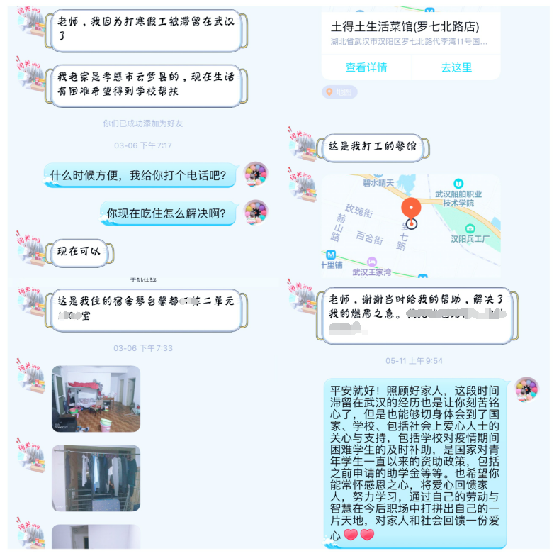 2017级郑巍同学因武汉封城,独自滞留武汉打工处近3个月,期间他乐观面对生活的困难,配合社区疫情管控;虽然学习条件艰苦,仍然坚持完成了在线课程学习,并在公司老师关心下顺利申请了疫情临时困难补助。