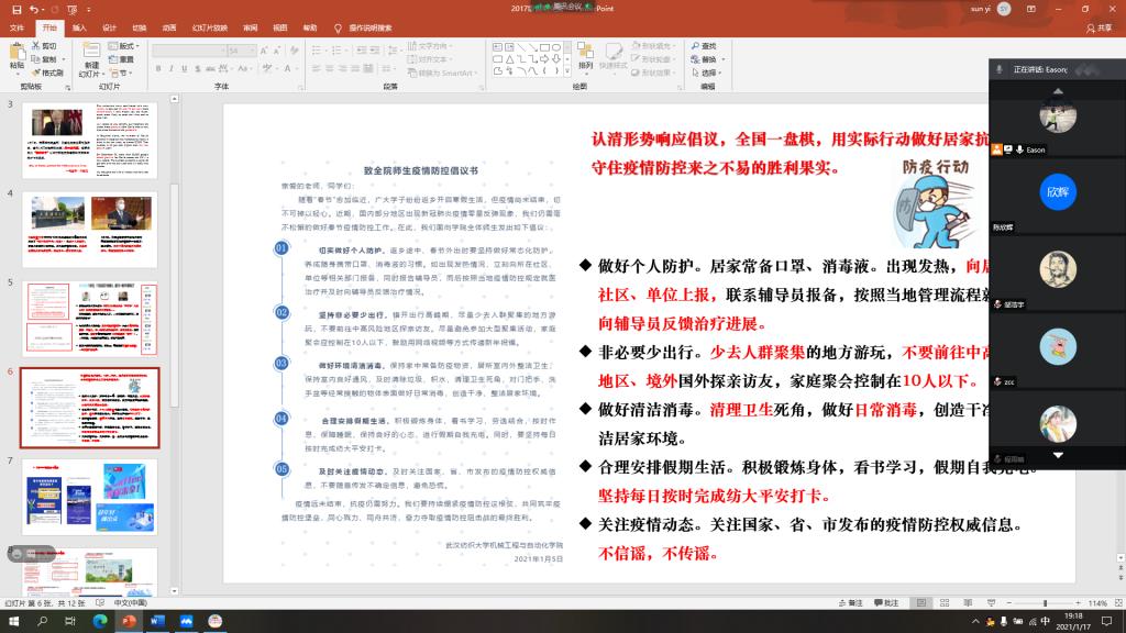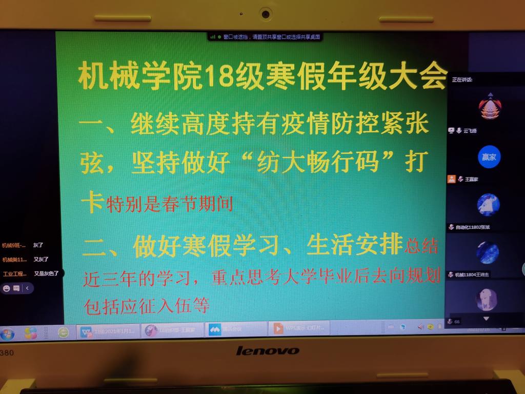 1月17日至18日,公司各辅导员分别组织召开了线上网络班会和年级大会,开展寒假假期安全教育活动,重点强调疫情防控注意事项,教育员工要切实增强个人防护意识,养成勤洗手、“一米线”等卫生习惯和生活方式;要求员工按照属地管理原则、服从属地管理,尽量减少外出,教育、引导员工以正确的认识和科学、安全的方法做好自我保护;提醒员工注意防范今冬明春新冠肺炎疫情与其他常见传染病叠加风险。各年级大会上,辅导员们还通过介绍公司退役员工士兵事迹等进行了征兵政策宣讲,营造氛围,积极引导有志青年踊跃参军入伍;提醒同学们警惕电信诈骗、非法校园贷;注意假期交通安全,防范迷信和宗教渗透风险。辅导员和班主任运用精心制作的PPT,结合具体案例,组织同学们在认真开展学习后各个发言,谈认识、谈感受,切实增强了教育效果。