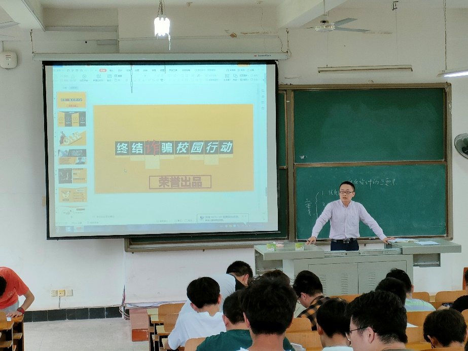 活动现场,辅导员谢超老师结合江夏区一年内受骗案例分别从年龄,学历分布进行典型案例分析,结合常见形式和诈骗种类以及校园贷的特点、常见手法及危害,为同学们讲解了不法分子常用的诈骗手法和作案特点,通过大量触目惊心的真实案例介绍了多种诈骗手段,如诱骗利用购物刷单,微信、QQ、短信冒充身份,冒充网购客服,忽悠办理信用卡、校园贷款等,并针对每种诈骗手段给出了有效的应对策略,提醒大家要理性消费。同时告诫同学们防范诈骗要做到“五不”(不理睬、不点击、不轻信、不泄露、不转账)、“三快”(被骗后急救快申诉、快报警、快取证),并第一时间拨打110报警。