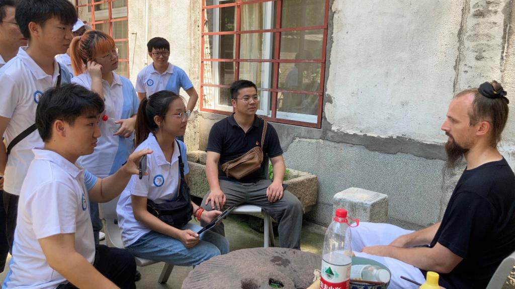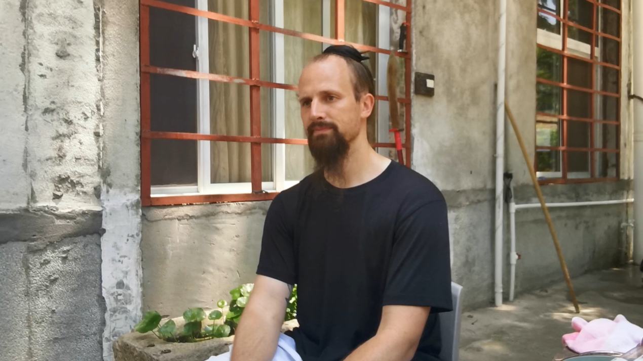 采访袁道长后,我们有幸有采访了外国友人Jake Pinnick(以下简称杰克),杰克自2010年来到武当山问道,自此深受武当文化影响,自愿留下学习武当文化。在武当山道家传统武术馆,杰克从基本拳学起,掌握了八仙棍、形意拳、太极拳、气功等武术功法,于2014年结业。此时,其他的师兄弟都选择离开,杰克却留了下来,不仅因为人杰地灵的武当使他难舍,还因为他在这里收获了爱倩。