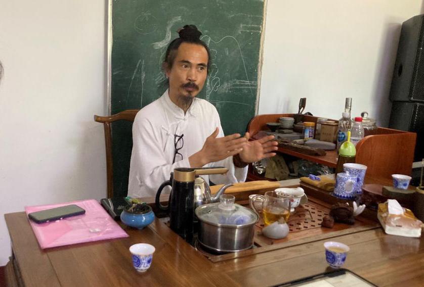 袁道长身着白衣履布鞋,发束木簪,神色泰然,一身浩然气,举止端庄言语自然。