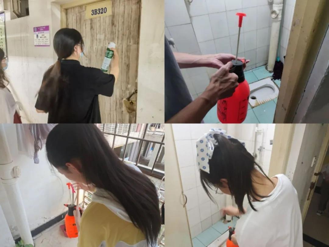 活动中,50余名志愿者们带着消毒工具深入寝室楼三栋和四栋208间高年级同学宿舍。志愿者们先礼貌的问候寝室人员是否需要消毒,经过同意后进入宿舍,在消毒过程中主要针对日常清扫中容易忽视的洗簌台、床底、阳台等寝室安全卫生死角进行消毒和杀虫工作。同时,志愿者们积极向寝室人员宣传寝室日常防疫知识,确保良好卫生的休息和学习环境。