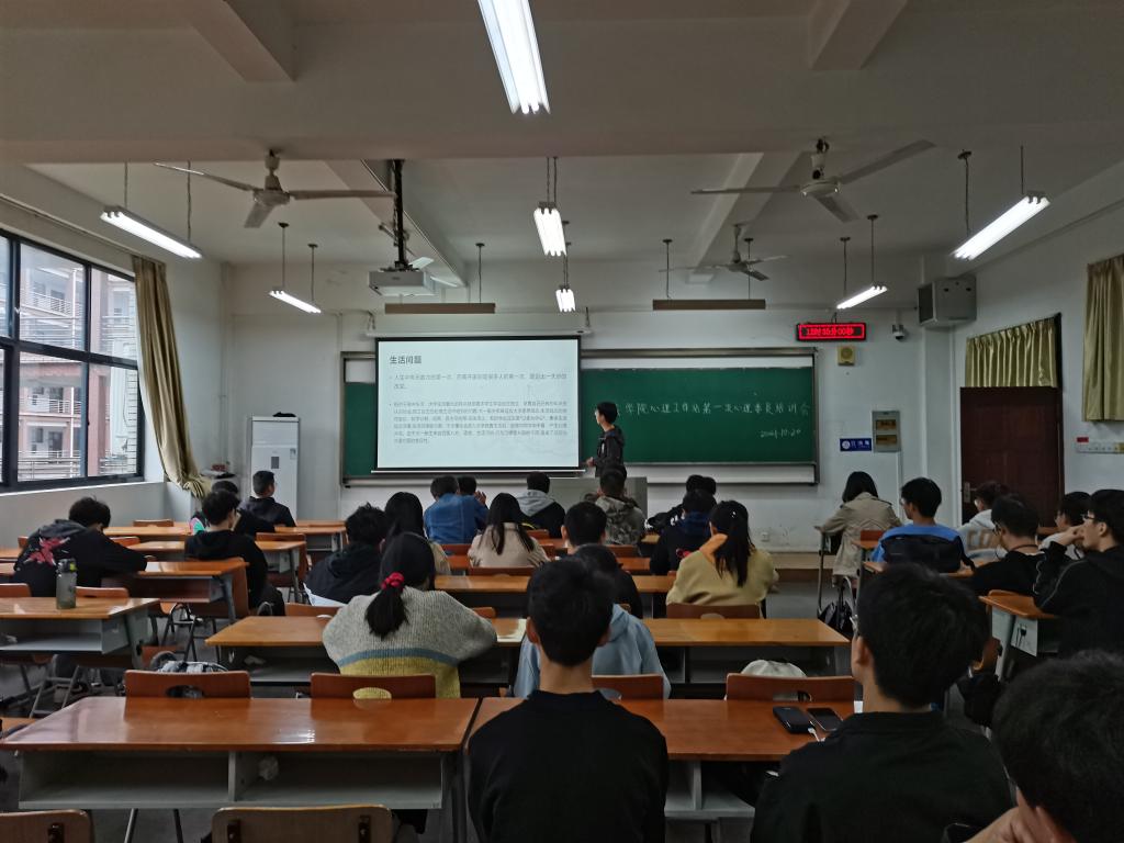 本次培训会主要围绕老员工新生如何适应老员工活展开。首先心理委员代表任钰茏同学介绍了新生入后在独立生活、人际交往、学习模式等方面的不适应。并且建议在与人交往过程中,要学会宽容,学会反思,学会倾诉,积极去改善同学间的关系,在学习过程中,要端正好自己的学习态度,不能过度的放松自己,压力过大的时候可以给自己积极的心理暗示,相信自己能够学好。同时也呼吁新生积极的去调整自己适应老员工活。