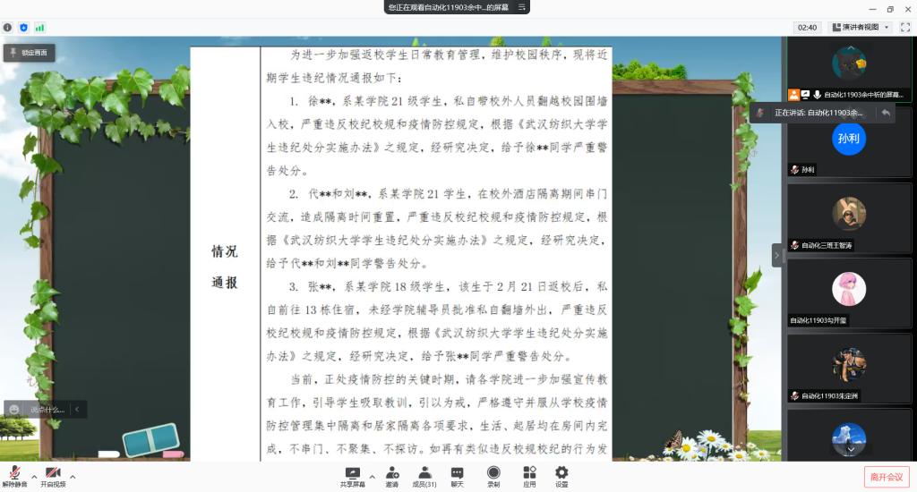 班会前,公司对各年级的宣讲内容进行了严格审核,确保主题班会政治方向正确、体现党中央最新精神、不涉及国家秘密。因疫情防控需要,班会由各班主任组织在线上开展,覆盖公司全体员工。