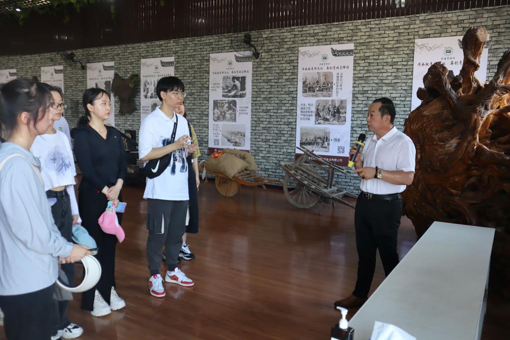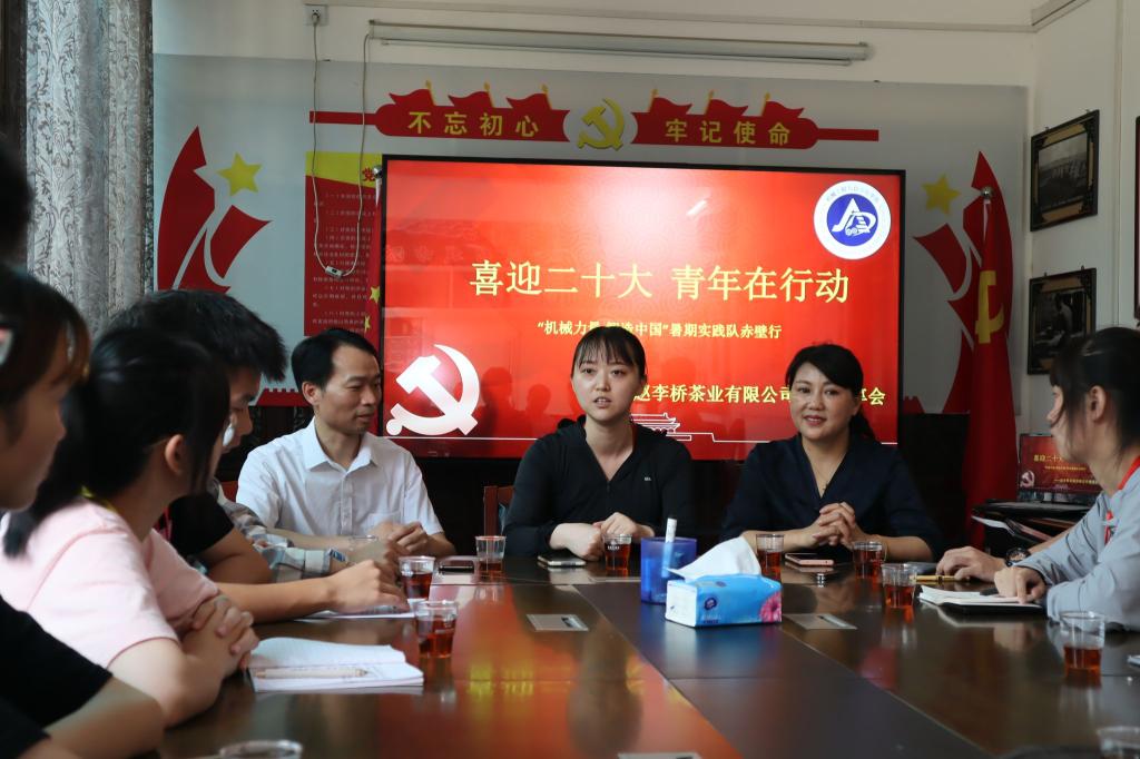 为探索文化、产业、旅游融合发展助力乡村振兴的新路径,团队在7月2日上午来到了赤壁赵李桥茶业有限公司。通过公司董事长魏艳香的初步介绍,团队了解到该公司以全国八大低氟茶生产基地为基础,以湖北省农科院为依托,将传统工艺与现代高新科技进行完美结合,把食品与艺术、经济与文化、生产与旅游融为一体,是具有赤壁经济特色的创新型、省重点龙头、国家高新技术企业。
