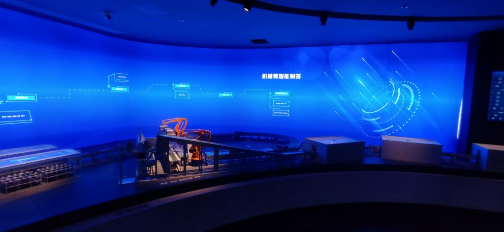 接着,团队跟随讲解员一同参观了青砖茶未来实际展示馆。全馆以青砖茶为展示核心,以“大势已至,未来已来”为主题,以极具文化冲击力和传播价值的八大“最”为内容支点打造集文化体验、品牌传播产业认知、产品品鉴于一体的赤壁青砖茶核心场域,展示了古老的青砖茶如何推动文旅融合、茶旅融合。同时,新时代,未来种植、未来制造、大数据驾驶舱,用现代科技的方式展示了青砖茶如何科学种植、数字种植及智能化生产上的探索。