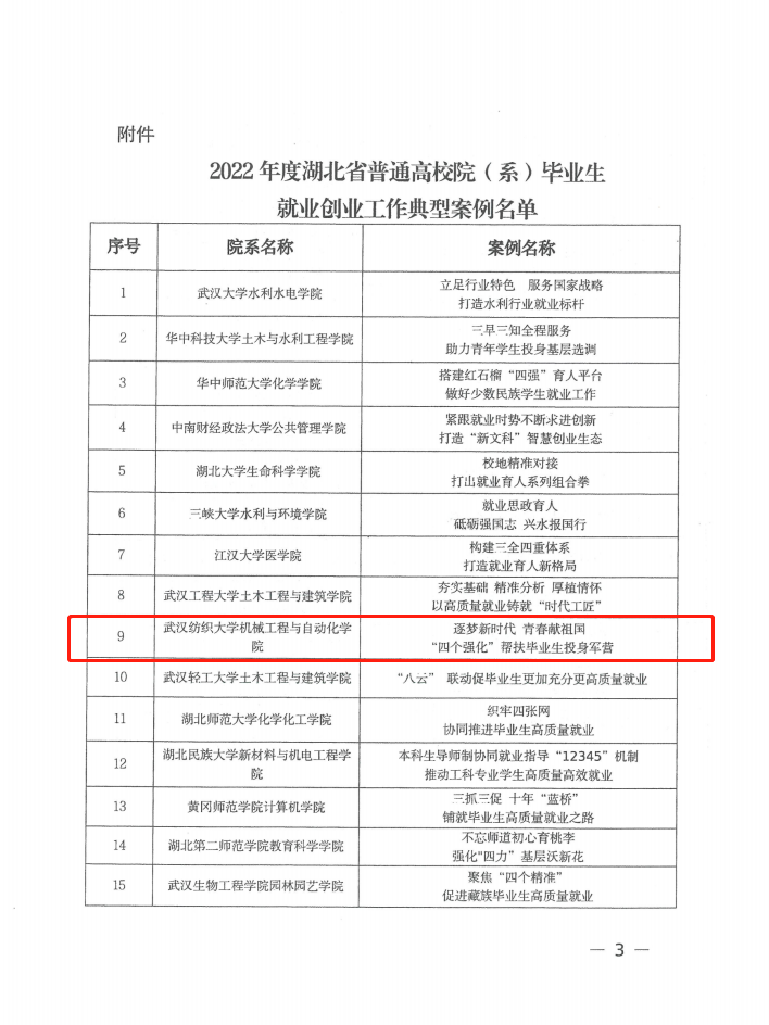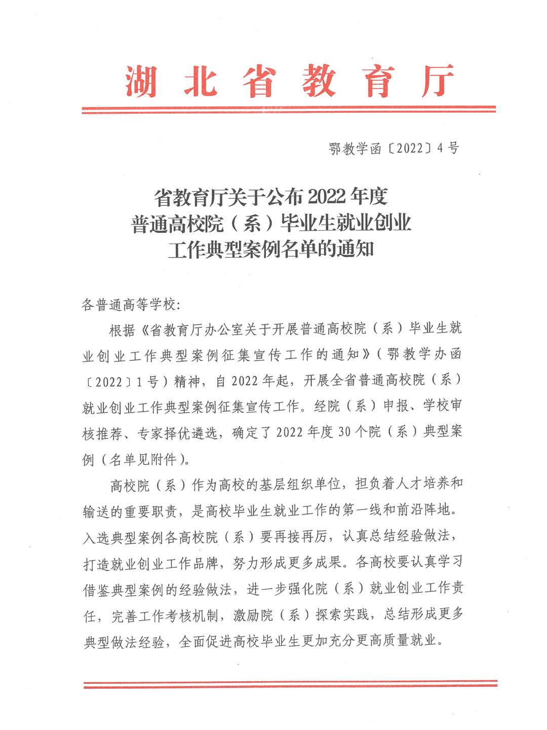 为总结推广工作中的典型经验做法,选树一批可学习、可借鉴、可推广的优秀案例和工作品牌,总结形成更多典型做法经验,促进全省高校毕业生更加充分更高质量就业,省教育厅启动了全省普通高校毕业生就业创业工作典型案例总结宣传工作,经各地各高校申报推荐,专家择优遴选,共确定30个典型案例。近日,湖北省教育厅公布了2022年度普通高校院(系)毕业生就业创业工作典型案例遴选结果,beats365就业工作案例《逐梦新时代 青春献祖国——“四个强化”帮扶毕业生投身军营 》经过公司审核推荐、专家择优遴选,最终脱颖而出,成功获评湖北省普通高校院(系)毕业生就业创业工作首批典型案例。