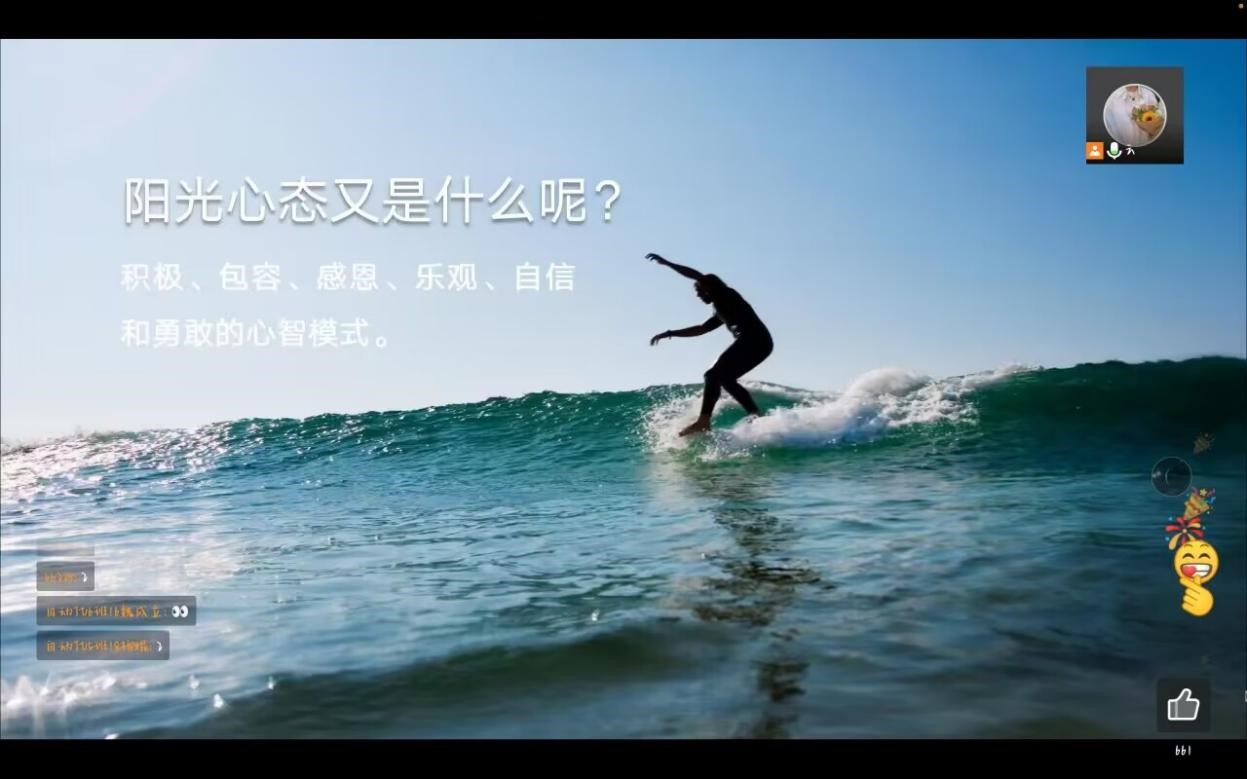 周老师先为大家引入今天的团课主题——阳光心态,美好生活。分别从阳光心态的定义、阳光心态的影响以及建设阳光心态的方法三个方面展开介绍。