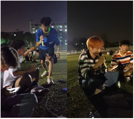 晚上,公司同学们在田径场草地上席地而坐,共同聆听音响中传来的美妙歌声,回忆多姿多彩的童年,共同庆祝美好的国庆节,每当自己熟悉的歌声响起时,同学们都会慷慨激昂,一起合唱起来。