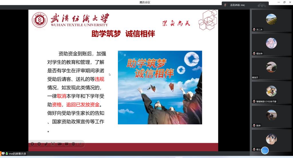 9月中旬至11月上旬,公司多次召开资助政策宣讲主题会议。各年级班主任和辅导员采取线上、线下的形式,开展主题班会、年级会议和资助评议组成员会议,将国家资助政策分条列点向同学们详细讲解,帮助同学们分析各类奖助学金的申请条件,提醒同学们按照规范进行申请。会上,老师们重点强调,监督评议材料真实、过程公平公正、评议结果公开透明,教育引导员工在获得奖助学金后,要合理分配资金支出,抵制铺张浪费、大手大脚等情况,要把钱花在“刀刃”上,支撑学业,帮助家庭减轻经济负担,多在提升学习能力和综合素质能力上下功夫。