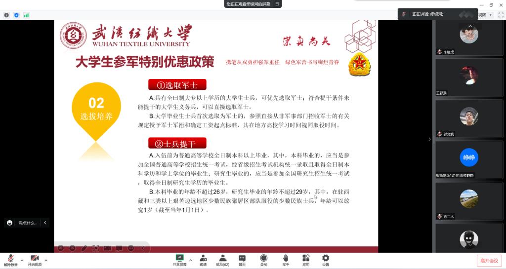 各年级辅导员老师着重从参军优待政策和对个人成长的帮助方面介绍了2023年春季参军入伍的注意事项,并强调参军入伍要谨防上当受骗,只有全国征兵网一处报名渠道且体检等完全免费。鼓励同学们携笔从戎,报效祖国。