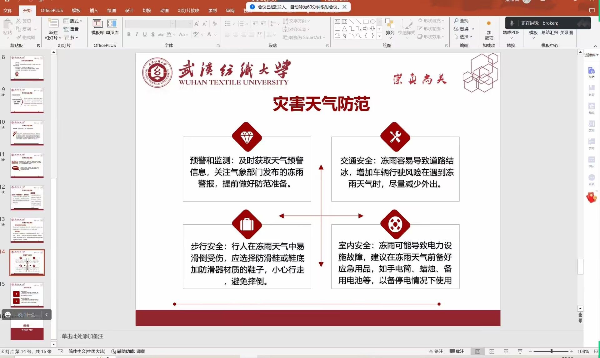 会上,辅导员和班主任老师们通知了同学们具体返校和上课时间,向大家详细讲述了近期极端天气变化情况下,需要注意的各种安全隐患,涵盖了返校、出行、宿舍生活等多个方面。老师们特别强调,在下大雪、冻雨和冰粒环境下,道路结冰速度快,出行安全很难得到满分保障,同学们要预防各种出行隐患,合理规划返校时间,减少外出;在气温回暖化冻期间,要留意避开屋檐、桥下、树下等容易有高坠物的道路,避免被砸伤。同时,老师们还特别提醒了大家要注意消防隐患,通过具体案例向大家阐述消防安全的重要性,提高警惕,再次强调了防范电信诈骗的重要性。
