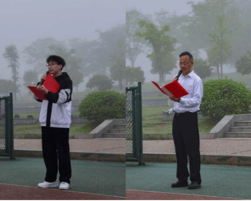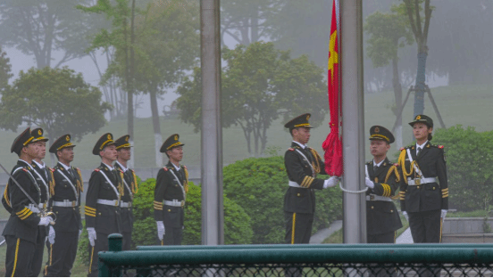 7点整,国旗护卫队迈着整齐的步伐护送五星红旗走向旗杆。在庄严的国歌声中,鲜艳的五星红旗冉冉升起,全体师生面向国旗行注目礼。