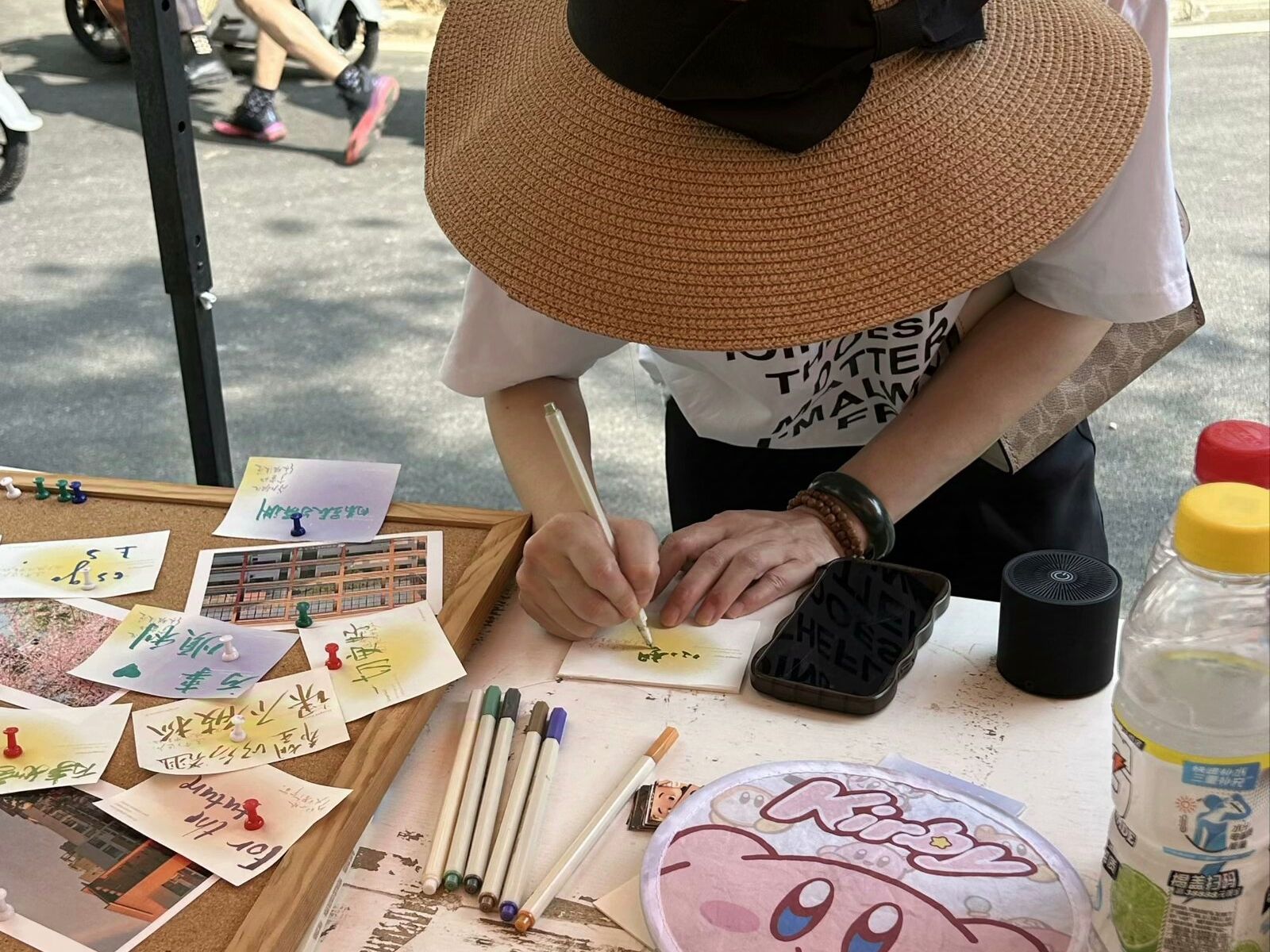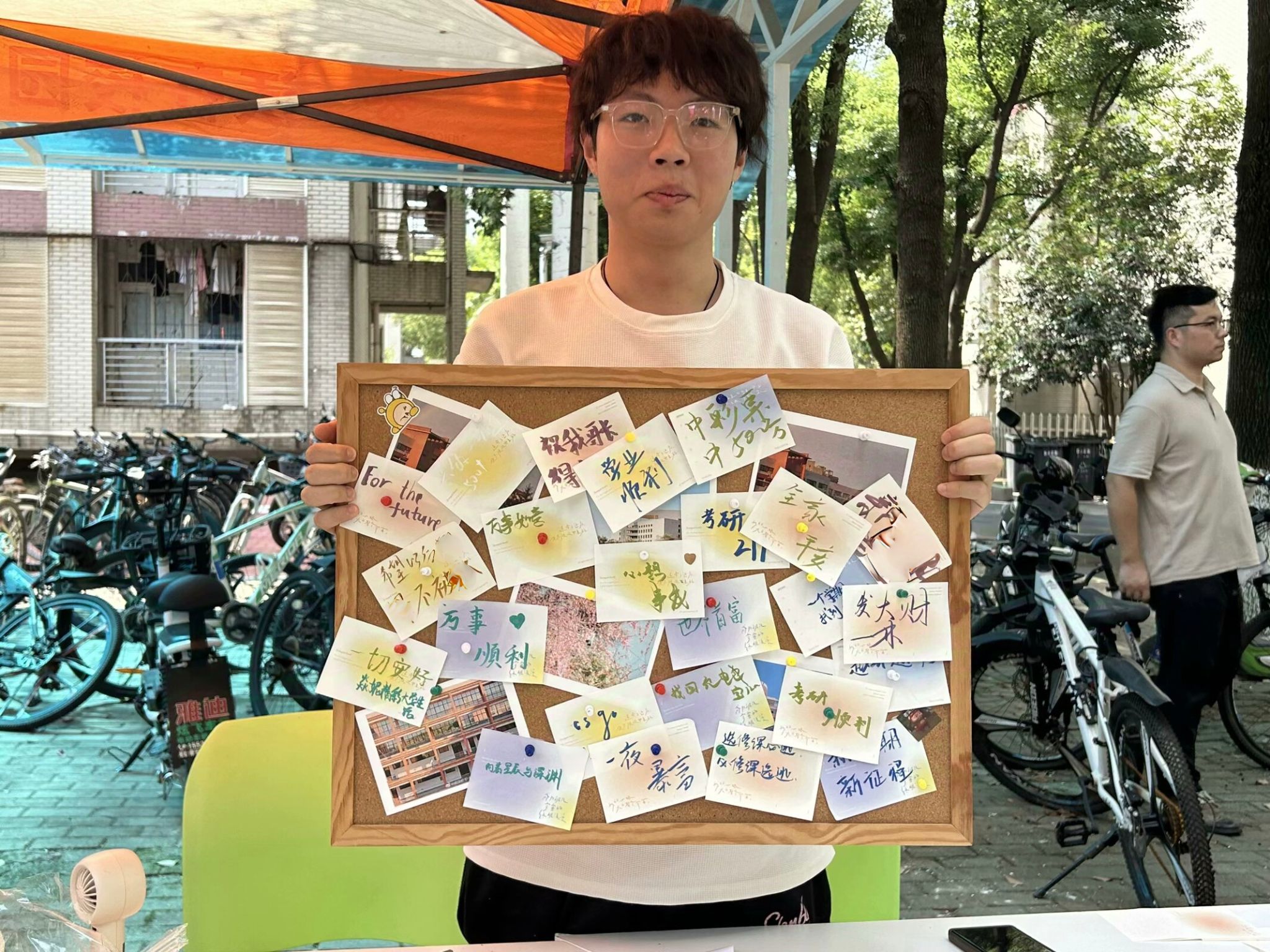 志愿者在迎新摆点处布置好了愿望板、多种纺大风景明信片,为迎接新生的到来做好了十足的准备。刚刚来到公司的新同学在精心挑选自己心仪的纸片并将对未来自己的美好期望写在上面并将其钉在愿望板上,与家长一同憧憬美好的未来。