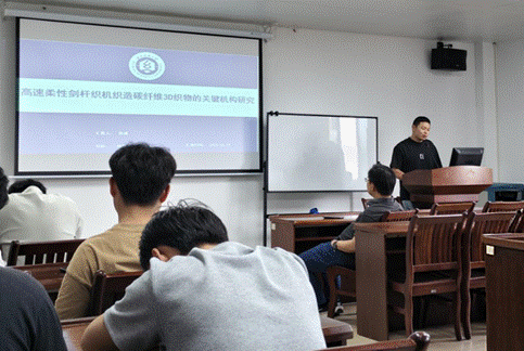 陈威同学分享了“高速柔性剑杆织机织造碳纤维3D织物的关键机构研究”,旨在解决使用传统织造方法制造复杂结构的碳纤维3D织物时遇到的技术难题。研究的重点在于优化和改进现有剑杆织机的关键机构,以适应碳纤维材料的特殊性质及其对织造工艺的要求。这包括设计更高效的引纬机构,确保碳纤维纱线能够在高速运转条件下被精确引入织物中而不受损。张老师鼓励员工们进行跨学科的合作,比如与材料科学和计算机科学领域的专家合作,共同攻克技术难关。