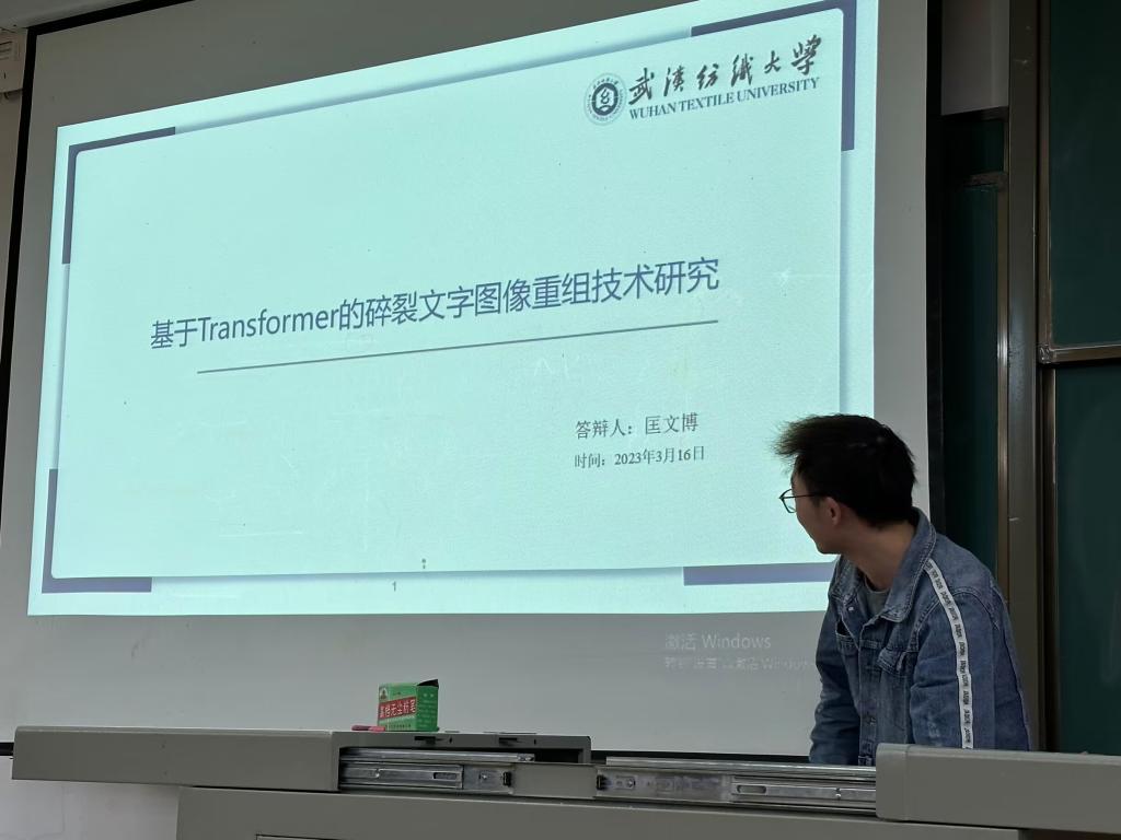 匡文博同学的研究内容是“基于Transformer的碎裂文字图像重组技术研究”。罗教授针对赵俊杰同学的分享给出了建议:一是无论是硕士还是将来读博士,科技材料的写作都是不可缺少的。读博士、进企业工作,我们科班出身都会协助写项目申请书,所以要加强对关键问题的凝练;二是关于创新点的选择,聚焦1-2个创新点就好,研究尽可能细致深入。